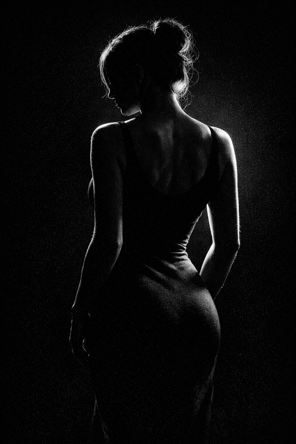 A dramatic low-key study that utilizes high-contrast rim lighting to define the subject's athletic curves and silhouette.